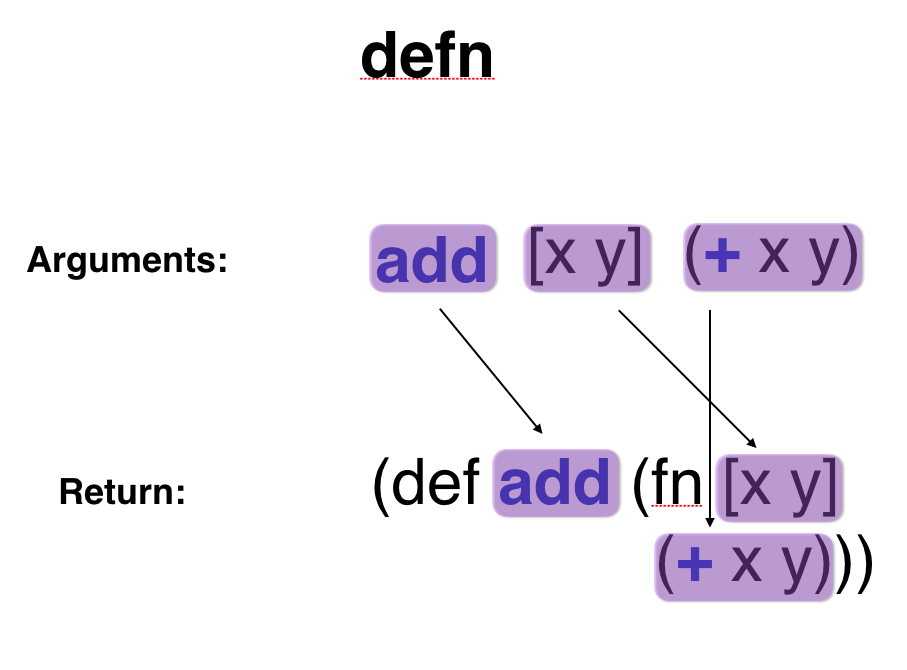 There are two things that make a macro function special though. The first is that the type of its arguments and the type it returns are not general values but source code. That means it takes code in as its input, and returns code as it's output. Here's a couple of familiar functions along with their (pseudo) types for comparison. map takes an array as its input, and returns another array. sum takes an array as input, and returns a number. defn takes code input and returns more code.